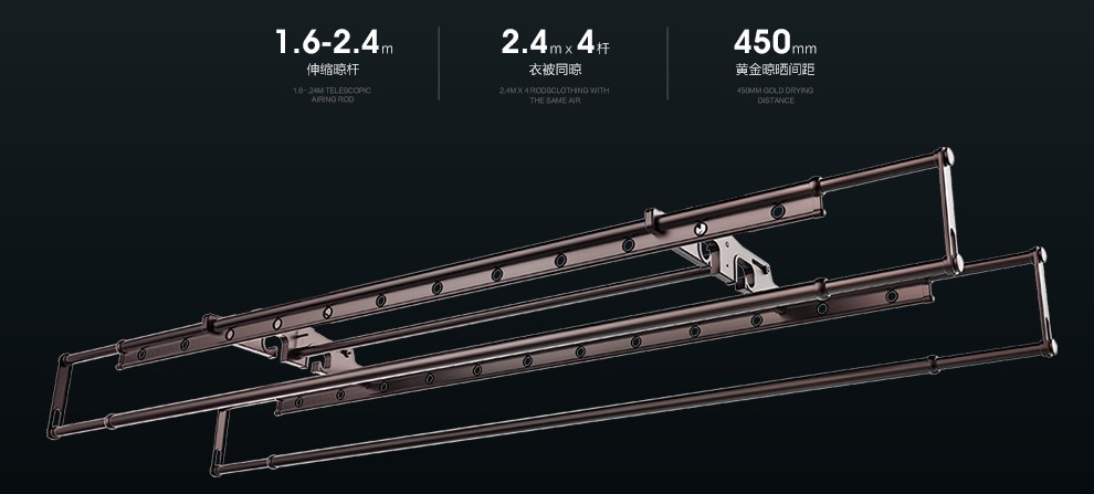晾衣機(jī)最核心的功能,當(dāng)然是晾曬。一般晾衣機(jī)的配置是4根晾桿(2根晾衣桿,2根晾被桿)。